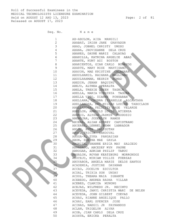 The members of the Board of Medical Technologists, Dr. Marilyn A. Cabal-Barza, and its chairman, Dr. Leila Lany M. Florento, served as its leaders. The first and second MedTech schedules for 2023 were held at N. C. R., Baguio, Cagayan de Oro, Cebu, Davao, Iloilo, Koronadal, Legazpi, Lucena, Pagadian, Pampanga, Rosales, Tacloban, Tuguegarao and Zamboanga this August 2023.